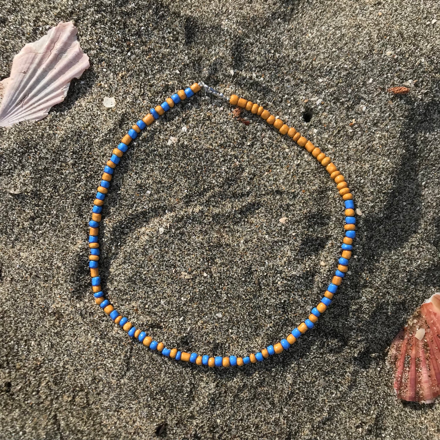 A 40cm hand-beaded necklace crafted by Sly Studio using a mix of rescued and vintage beads. Each piece is assembled by hand in Tāmaki Makaurau, featuring a secure clasp and unique patterning that makes every necklace one of a kind. Ethical, thoughtful, and designed to last.
