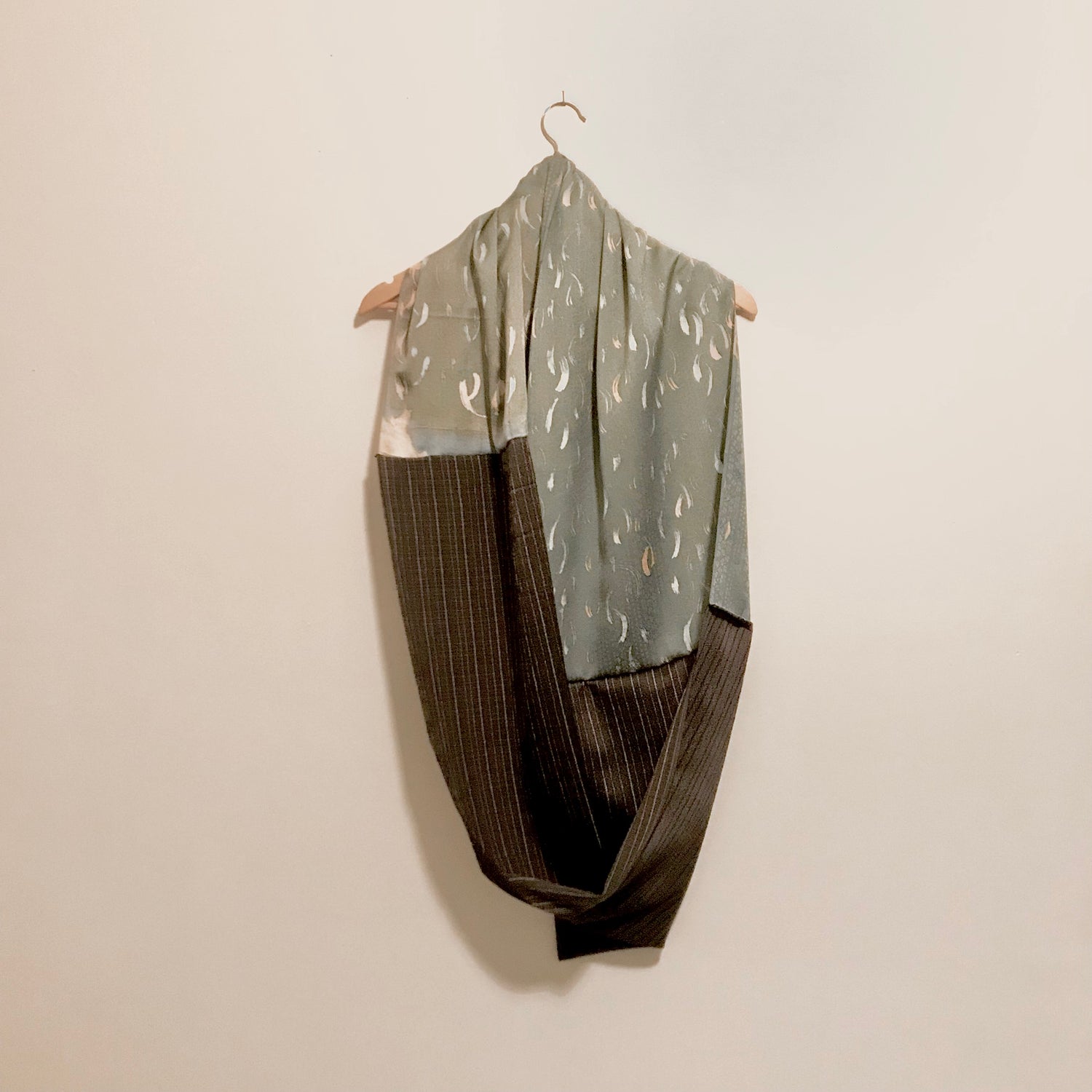 Sly Studio Zero-Waste silk scarf, made from soft, vintage kimono silks, two metres long. Reversible, can be worn long or doubled up, also works well as a head and neck scarf combination.